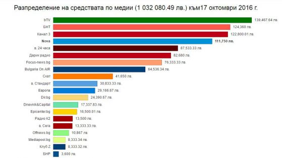 Най-щедри в медийната си кампания до момента са от кандидат-президентската двойка, подкрепена от БСП. За популяризирането на тандема ген. Румен Радев – Илияна Йотова през първите 10 дни са сключени договори на стойност 353,015.77 лв. След тях се нареждат кандидатите на ГЕРБ Цецка Цачева и Пламен Манушев с 225,208.73 лв. и кандидатите на АБВ Ивайло Калфин и Любомир Халачев – 157,410.52 лв.
