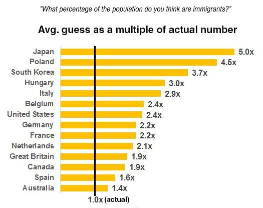 Знаят ли всъщност жителите на богатите страни колко са имигрантите в страните им? Проучване на IPSOS показва, че те са ужасно дезинформирани. Ето какви са отговорите на въпроса "Според вас какъв процент от населението са имигранти?" – гражданите на някои страни вярват, че те са в пъти повече, отколкото те наистина са: